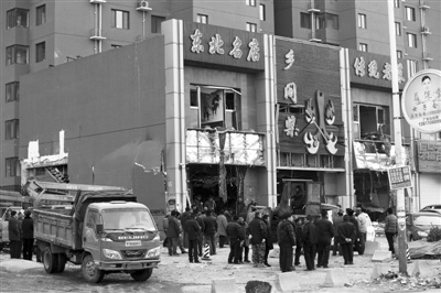 昨日15时30分许,该饭店一楼东北角墙体出现一个几平方米的“鼓包”,驻守在现场的特警说,这是饭店爆炸的位置。