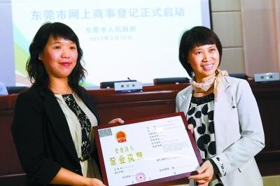 2013年3月18日,东莞市工商局工作人员(右)为第一批成功在网上登记的商户颁发营业执照。