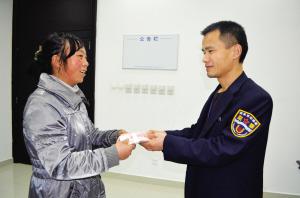 南明区劳动保障监察大队工作人员向民工发放讨回的工资