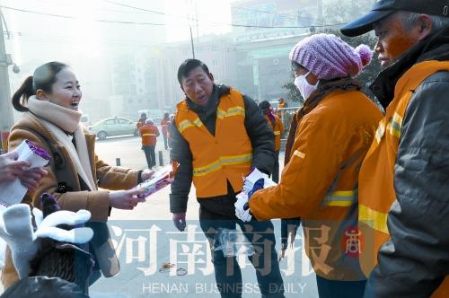 “谢谢、谢谢你对我们的关心,我们会把街道打扫得更干净。”接到手套后,环卫工人都这样说道。(河南商报记者段睿超)