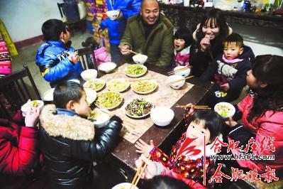 晚上6点,这个农家大院里炊烟升起,橘黄色的灯光照射着空荡荡的堂屋,一旁的厨房里,农家土灶上的锅盖掀开,一盘菜起锅,厨房里升起了热腾腾的雾气。不一会,空荡荡的堂屋里挤满了人,桌上摆满了热腾腾的饭菜,没有座位的人端着饭碗,轮流到桌上夹菜。