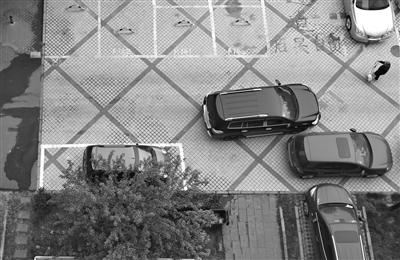 去年10月9日,朝阳恋日绿岛小区,停车位占用了北门正对的广场和消防通道。新京报记者 黄月 摄