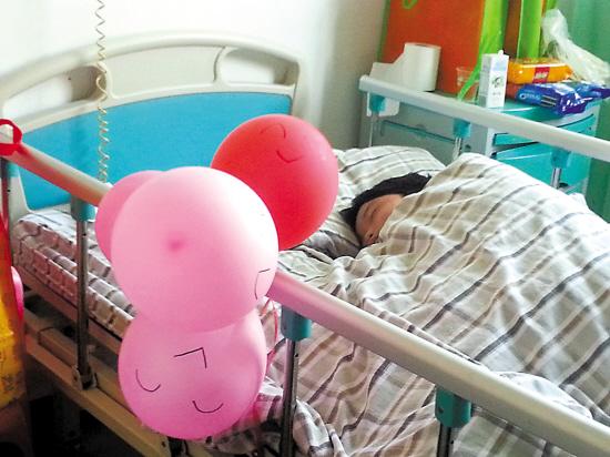 小涛在病床上安睡,床边画上笑脸的气球是护士为逗他开心而准备的
