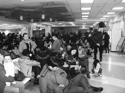 在内科诊室的门口,上百个座位早就被候诊的家长孩子挤满,有的孩子实在没地方坐,只好靠着妈妈无精打采地坐在地上。刚刚六个半月的珍珍趴在妈妈肩头上,一张小脸烧得通红,不时地打着挺儿,爆发出一阵剧烈地咳嗽。珍珍妈妈的眼睛下面全是乌青,还努力镇定地开着玩笑:“这儿是晒宝大会,儿童医院门诊大楼5层,每一个地砖上都站着两三个宝宝。我们赶了大早过来挂上了号,到现在还没叫到呢。”