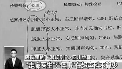 兰越峰给记者看了他们超声科的一些检查结果。一名患者检查的是妇科,但她的超声描述里竟然写着前列腺;一名患者检查的部位是心脏,她的超声描述又说起了肾脏;一名患者检查的部位是甲状腺,超声描述却是双眼。在这些检查结果中,让人云山雾罩的结果比比皆是。
