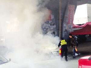 “浇了几盆水,眼看着火要灭了,转眼又烧了起来!幸好警察找来灭火器把火迅速扑灭。”路边一水果摊老板说,经过几次扑火,车上余火被彻底扑灭;火扑灭后,发动机还在转,警察又帮助切断线路。