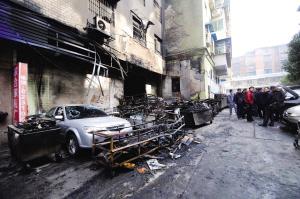 昨日上午,记者赶到位于凯里市金桥路(夜市一条街)家合花园,院坝里的大火已被扑灭。火灾过后院坝一侧只剩一堆“残骸”,所烧损及烧毁的均是夜市小吃摊位,共有10余个。停在这些摊位中的一辆轿车,被烧得面目全非,不少停在一旁的机动车车头处,都有不同程度受损。