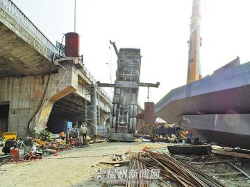 记者在现场看到,意外事故导致鳌峰桥下的江滨中大道东往西辅道路段暂时封闭。工地内一台吊车翘起“站立”在鳌峰桥下,车头探出桥面。长约10米的预制钢箱梁,一端滑落砸在工地上,另一端卡在近10米高的桥墩上。六七米长的液压吊臂砸向工地外的江滨中大道,滑落的钢箱梁一角被吊臂击中而变形。