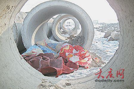 水泥管里放着破旧的被褥