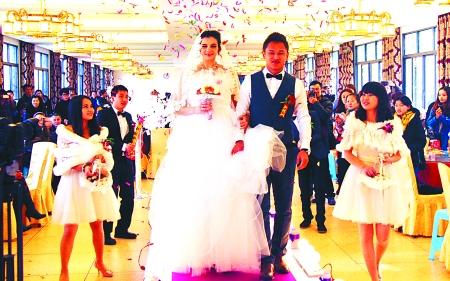 商报1月17日曾报道一个俄罗斯艺术体操美女、重庆理工大学研究生杨梅,在酒吧与梁平崽儿廖鹏相识、相爱的故事。昨日,在梁平翠屏山庄,廖鹏和杨梅举办了传统的婚礼。