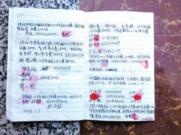 唐女士从包里拿出了一个笔记本,记者看到,这个笔记本共写了约20页,分别是讲治镇的部分居民对于自己所缴纳的入户费用以及未开发票情况的说明,大多都是1800-2500元不等,并按有当事人的手印,记者粗略估算了一下,共有百余人在这个笔记本上按了手印。