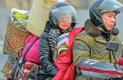 依偎 一家三口骑摩托车返乡。 朱建国摄
