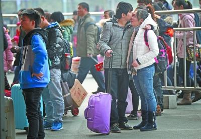 昨天,一对恋人在武昌火车站进站口亲吻相拥。当日,武昌火车站发送乘客7.5万人次,江城迎来节前客流最高峰。记者 胡伟鸣 摄