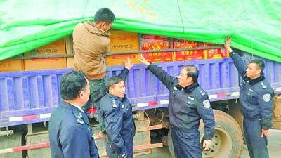 市公安局副局长夏建中(右二)正在查处违法运输鞭炮的大货车。