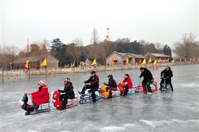 北海公园,游客们在冰面上玩“接龙”游戏。