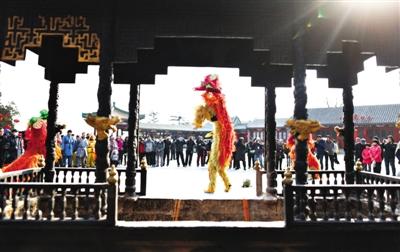 昨日,八大处公园新春祈福庙会,民间艺人在进行舞狮表演。