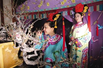 颐和园身穿宫廷装的工作人员在布置梅花展。