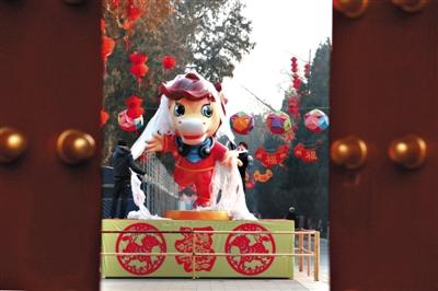节俭办会是地坛庙会今年的一大特色。昨日,庙会吉祥物“春马奔奔”在地坛西门内亮相,据悉,除了吉祥物、走马灯等必要生肖元素外,庙会内其他近7成布景都为重复利用。