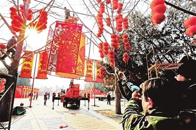 北京地坛庙会环境布置准备就绪 七成用料来自旧物
