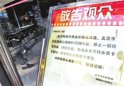 “为什么突然停业?”“以往的会员卡及兑换券如何使用?”“何时能够再次营业?”昨天上午,短短半个小时内,就陆续有四五位市民前来观影,走到门口才发现影城已停业,均表现出十分诧异。“20日就停业了,如果有会员卡要赶快到影城办理退卡,一过年就没人负责办理了。”一位身穿保安制服的工作人员坐在门前,指着大门上贴着的几张告示告诉北青报记者。告示中提到,影城关闭是受隆福寺商业街整体改造影响。