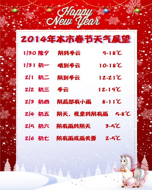 本市春节前期多云为主,平均气温较常年明显偏高,2月1日极端最高气温可达20~22℃。3日局部有小雨,5~6日有雨或雨夹雪天气。3日起气温下降,极端最低气温2℃左右。