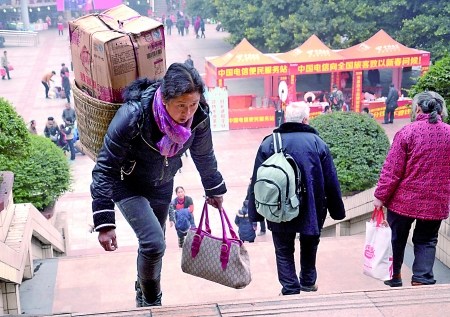 方女士很时尚,不过赶上了春运,这位年轻妈妈也摇身变为“女汉子”。中午1点左右,她一手提着行李箱,另一手提着几袋年货,还牵着3岁的女儿,一口气走上了火车站进站口前的长梯。