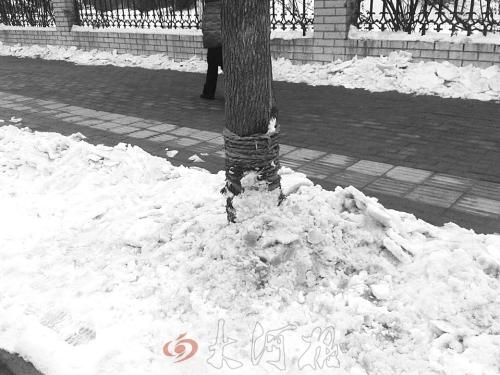 昨天中午,接到市民王先生反映,大河报记者随机走访农业路部分路段,一正在作业的环卫工告诉记者,快车道上的积雪撒有融雪剂,融化的速度较快,人行道上的积雪未撒融雪剂。有环卫工直接将含融雪剂的积雪堆在行道树下(如图),他们表示,并不清楚含融雪剂的积雪对树木生长是否有影响。