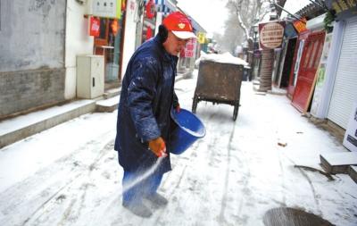 南锣鼓巷一名环卫工人在撒融雪剂。京华时报记者范继文摄