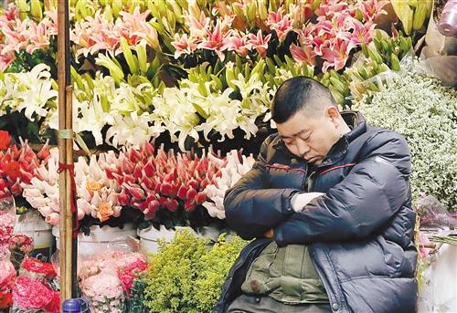 2月10日,渝中区鲁祖庙花市,一花店老板靠着座椅睡着了。由于云南近期下了一场罕见大雪,鲜花减产导致我市花价上涨,花店生意也受到一定影响。 特约摄影 谢智强