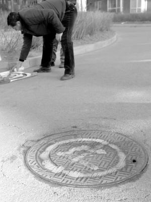 工作人员正往化粪池井盖上喷警示标志-华商晨报 华商响网记者 王舜天 摄