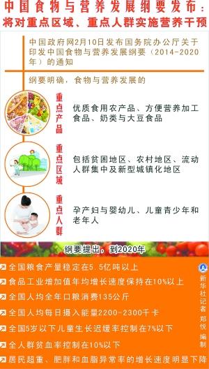 针对我国食物生产还不能适应营养需求,居民营养不足与营养过剩并存,营养与健康知识缺乏等主要问题,为顺应经济社会发展和城乡居民期待,昨天,国务院办公厅正式发布《纲要》,这是继《九十年代中国食物结构改革与发展纲要》、《中国食物与营养发展纲要(2001-2010年)》之后,我国政府制定的第三部关于食物与营养发展的纲领性文件,绘制出至2020年我国食物与营养发展的新蓝图。
