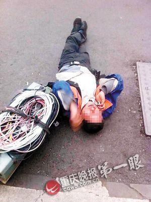 前晚5时50分左右,观音桥派出所民警张钦和同事赶到现场。保安焦急地望着地上的男子,男子戴顶毛线帽,两脚相靠,十分随意,嘴里念念叨叨。他身旁还放着一捆电线和一个工具箱。