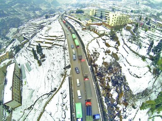 这是重庆晨报航拍工作室记者首次在条件艰苦的雪地里航拍成功,航拍也为当地交警部门提供了即时路况信息。