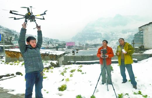 无人机在大雪中艰难起飞。
