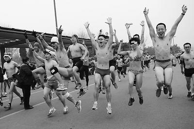 “真冷啊,赶紧活动活动!”比赛开始前的几分钟,原本都是裹着厚厚棉衣棉裤的人们,一下子脱得只剩下短衣短裤,这一下子谁是参加了好几届“光猪跑”,谁是头一次来就一眼分明了。已经参加过之前比赛的人们,总是最先脱个精光,然后立刻把精力放在了准备活动上,对周围相机组成的“长枪短炮”阵早已习惯了。