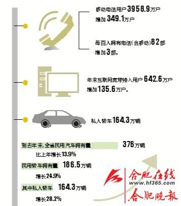 截至2013年底,安徽户籍人口达到6928.5万人,其中民用轿车拥有量186.5万辆,增长24.9%;宽带接入用户642.6万户,增加了135.6万户。昨日,记者从安徽省统计部门获悉,全省2013年国民经济和社会发展统计公报已经出炉,不妨来看一看安徽人就业、文化、卫生、保障等领域的关键数据。