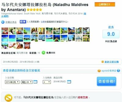 不过昨天她的好情绪受到了打击:除了机票,在酒店问题上遇到了麻烦。马尔代夫基本上是一个岛屿一家酒店,“琳达”看到跨国公司安娜塔拉集团旗下的几个岛在网上挺有名气,列为了住宿首选。可是万万没想到,这段时间安娜塔拉的薇莉岛、娜拉杜岛和笛古岛竟然都没有空房,在他们的官网以及著名的订房网站Agoda上查询都是如此,什么房型都是客满。