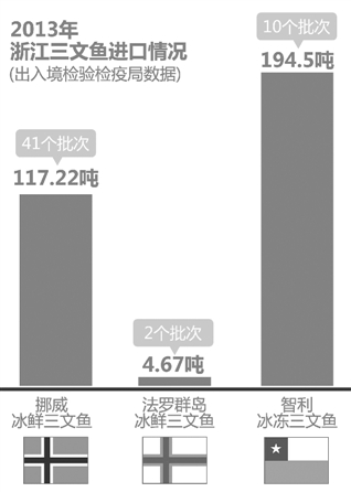 我们从浙江出入境检验检疫局了解了浙江去年的三文鱼进口情况:挪威冰鲜三文鱼有41个批次,总重117.22吨;法罗群岛冰鲜三文鱼有2个批次,4.67吨;智利的冰冻三文鱼10个批次,194.5吨。