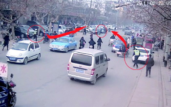 从视频监控中可以看到,9点48分,抢夺男子沿着康庄路南侧向西狂奔,一名协警在据其五十米左右的后方追赶,另一名协警则从马路北侧开始围堵,不少路人也纷纷停车查看情况。经过200多米追捕,在康庄路与解放大街交叉口处终将该抢夺男子抓获,并扭送至牡丹人民医院警务室。