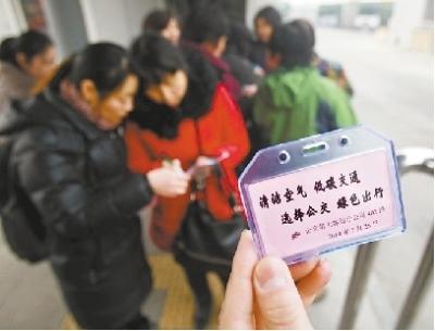 今天上午,公交车402路车队司乘人员向乘客发放绿色出行宣传小卡片,并向带驾驶证而选择公交车出行的乘客赠送小卡套等纪念品。刘航 摄
