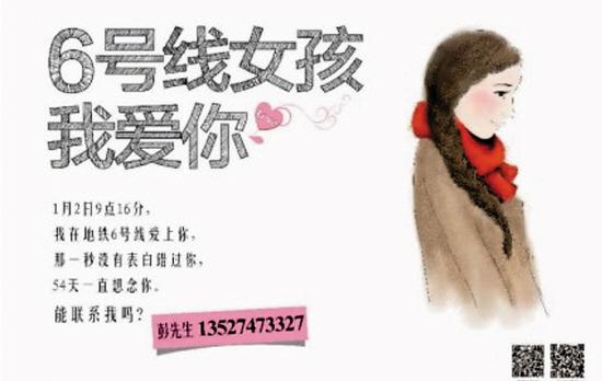 24日,重庆某报纸刊登了一小伙儿的求爱广告,引发网友关注。求爱广告上画了一个姑娘的漫画形象,并附文字“6号线女孩,我爱你!1月2日9点16分,我在地铁6号线爱上你,那一秒没有表白错过你,54天一直想念你,能联系我吗?”最后署名彭先生并附联系方式。