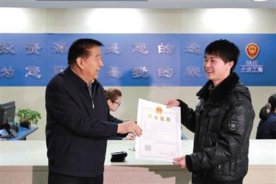 国家工商总局副局长刘玉亭(左)给创业大学生王世栋颁发首张新版二维码营业执照。通讯员 周祖涛 摄