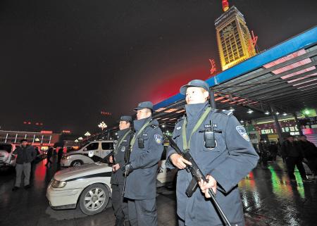 记者围着火车站广场绕行一圈,发现在进站口、出站口等人员聚集的地方,均有两名持枪特警站岗。另外,还有两名特警在广场周围巡逻。附近的一名环卫工人说,不论白天还是晚上,这些特警都在这里站岗巡逻,前晚,特警还带了警犬过来。旅客刘先生说:“有这么多特警在,我们感到很安全。”