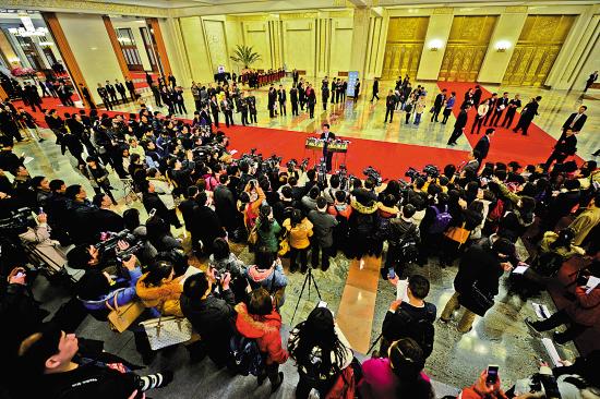 大批记者在人民大会堂北大厅的“部长通道”“围堵”进场的部长们 羊城晚报特派记者 陈文笔 摄