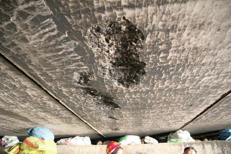 昨天下午,华西都市报记者赶到事发现场,在西攀高速公路王家沟中桥看到,这座桥梁底部和侧面,已被熏成漆黑一片。被熏黑的桥底,出现了大量不规则裂纹,有几处地方混凝土脱落留下小坑,露出了桥体内的钢筋。