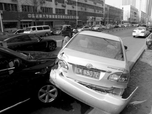 原来,中间的银丰田停在路边,车里没人。而它前后两辆黑丰田原本一前一后行驶,突然,前面的黑丰田一个急刹车,后面的黑丰田为了躲避,向右使劲一打轮,撞上了路边停着的银丰田,银丰田被撞得往前一蹿,又撞上了前面急刹车的黑丰田。