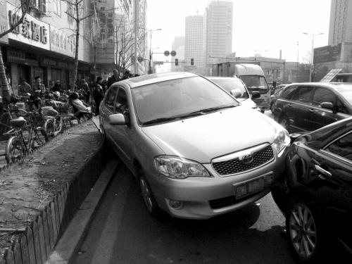 一车路边违停 被前后夹击骑护栏上后轮悬空(图)