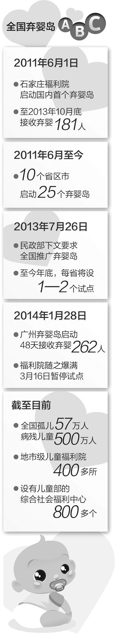 1月28日,广州市社会福利院婴儿安全岛正式启动试点。截至3月16日,安全岛共接收弃婴262人,远超过其他试点城市同期接收数量。接收弃婴的能力达到极限,福利院不得不暂停安全岛试点。