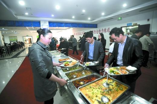 昨天中午12点15分,渝中区政府食堂内100多人正在用餐。午餐供应四荤四素,有回锅肉、萝卜肉丝、清炒南瓜丝、炝炒小白菜等。