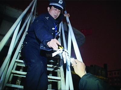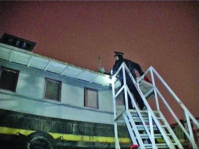民警取下落在轮船顶上的玩具飞机。